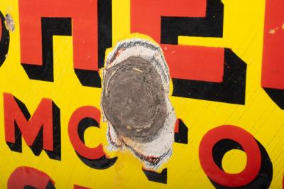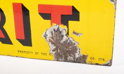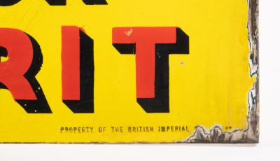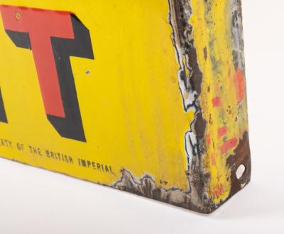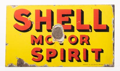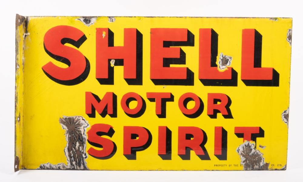 Lot 26 of 573: SHELL: An original enamel Shell 'Motor Spirit' flange sign by 'Vic Enamel Works Geelong' stamped to the lower with the makers mark and to either side 'Property of the British Imperial Co Ltd' 33cm high, 57.5cm wide