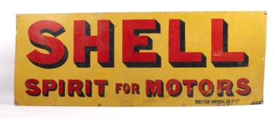 Lot 27 of 573: SHELL: A large early 'Shell - Spirit for Motors' sign, 45.5cm high, 122cm wide, has been repainted over enamel