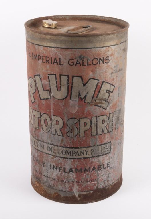 Lot 20A of 573: PLUME: A rare circa 1920s Plume Motor Spirit Vacuum Oil Company 4 imperial gallons drum