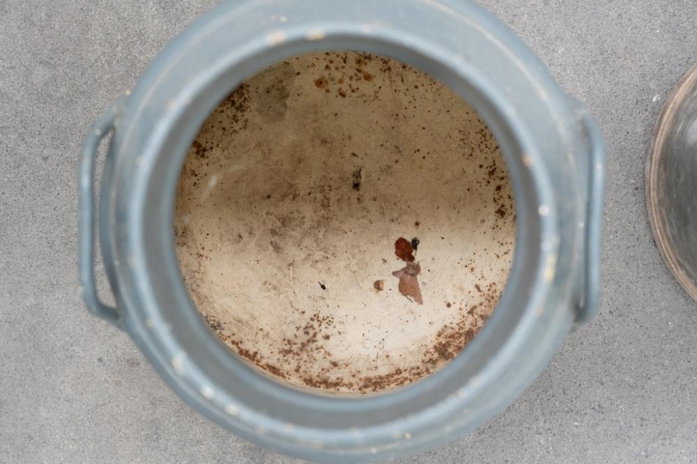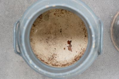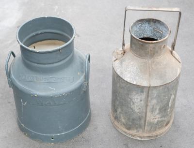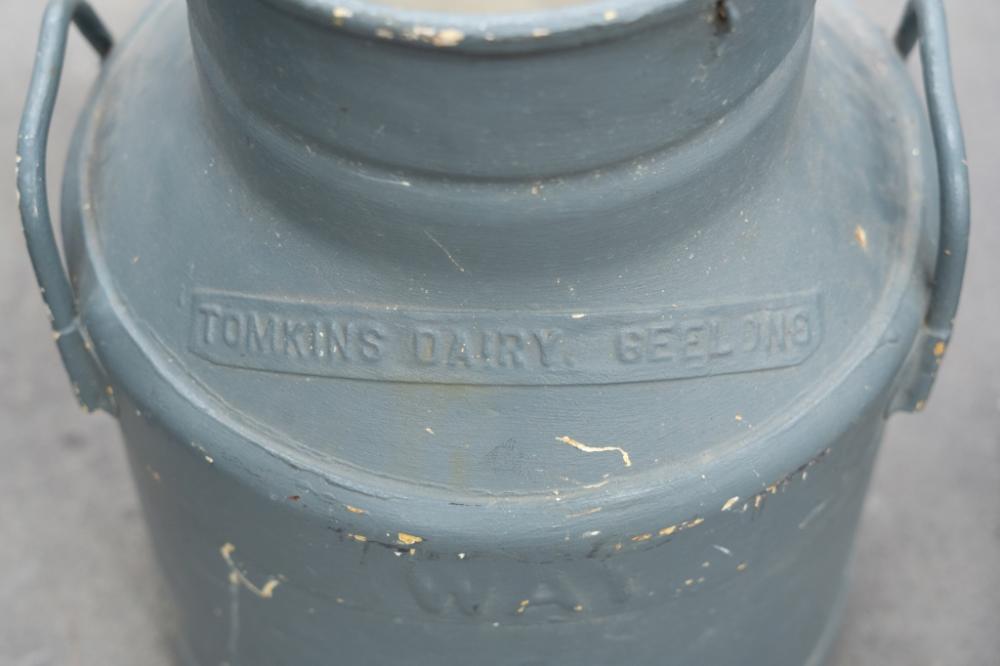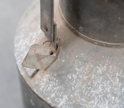Lot 24A of 573: JUGS: Two large jugs, including a four gallon galvanized jug with 'Supershell' tag and a Tomkins Diary Geelong milk jug, each approximately measure 48cm high