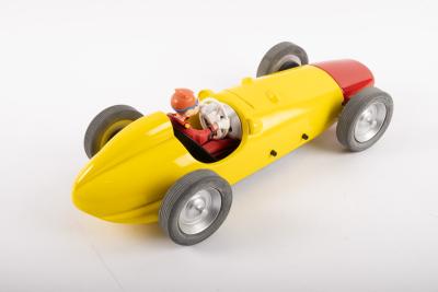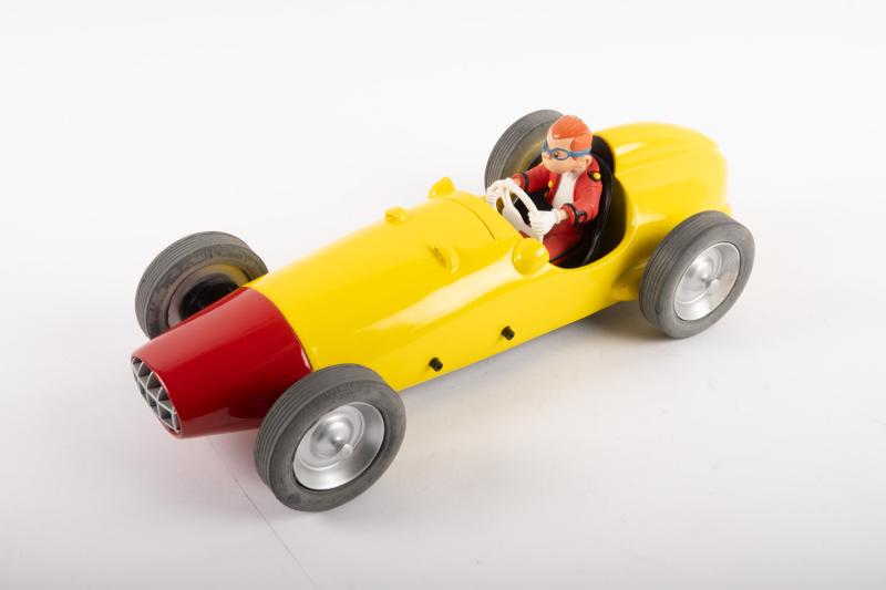 Lot 46 of 56: A striking heavy metal and resin 1:18 scale sculpture model by French artist Michel Aroutcheff of comic character Spirou in a turbo 1950s Grand Prix car, 32.5cm long