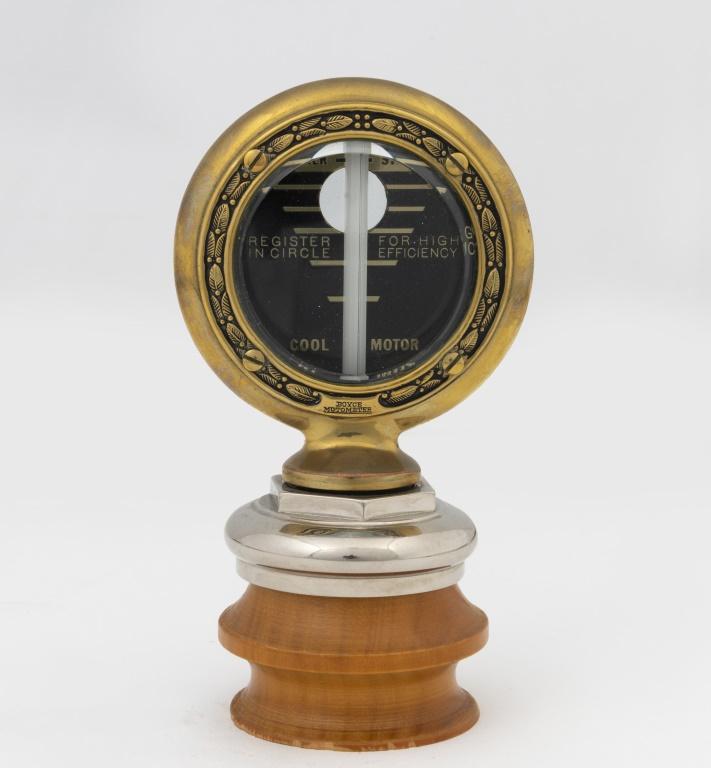 Lot 506 of 600: ROLLS_ROYCE: A c1900s Rolls-Royce brass radiator temperature gauge mounted on wooden base, gauge diameter 8.5cm, height 16cm overall
