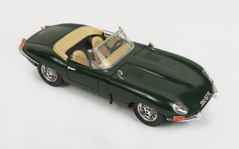 Lot 732 of 600: JAGUAR: A 1:18 scale Bburago Jaguar 'E' type coupe 1961, Special Collection, British Racing Green with light tan interior, with opening features, detailed engine and steerable wheels