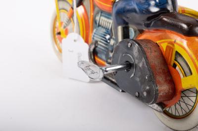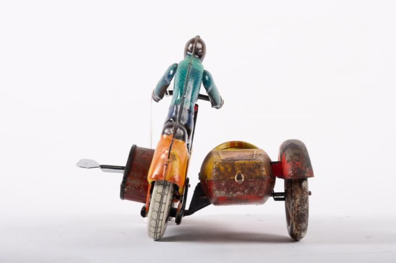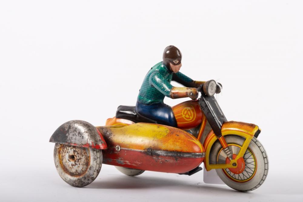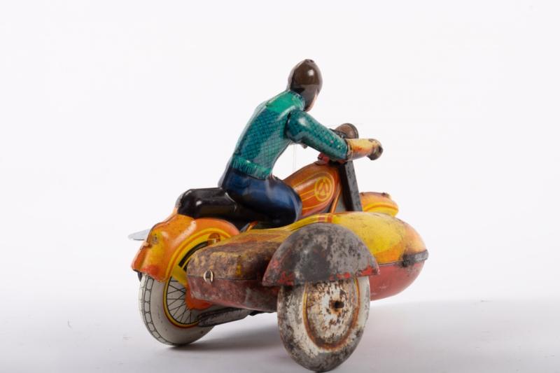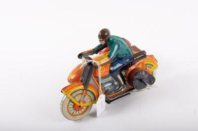 Lot 3 of 217: MOTORCYCLE: A c1950s USSR made wind up tin toy motorcycle with side car, 22cm long