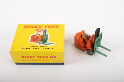 Lot 26 of 217: DINKY TOYS: A mid 1950s Dinky Toys No.401 Coventry Climax Fork Lift Truck in orange with green forks, within original box