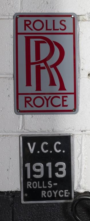 Lot 205 of 550: ROLLS ROYCE: Two Rolls Royce related items comprising a small reproduction enamel Rolls Royce sign and a tin 'V.C.C' 1913 Rolls Royce' plaque, largest 30.5cm high, 19cm wide.