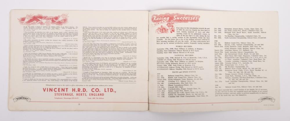 Lot 23 of 39: A rare circa 1950/51 23 page Vincent sales brochure outlining various models and racing success around the world including Australia, printed in England