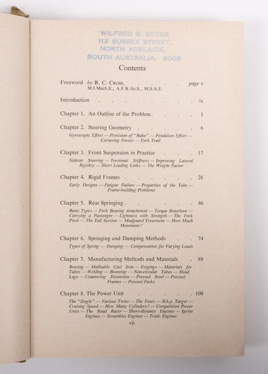 Lot 28 of 39: A second edition (1962) copy of the Motorcycle Engineering by P.E Irving with Wilfred Guyer library stamp