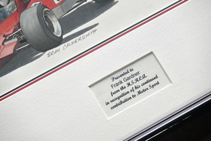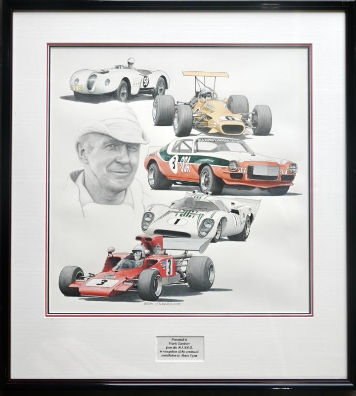 Lot 35 of 525: FRANK GARDNER: A framed print of Frank Gardner by artist Brian Caldersmith, presented to the driver by the HSRCA in recognition of his contribution to motor sport, 53cm x 58cm [Location: Sydney]