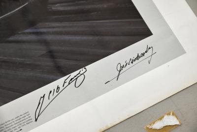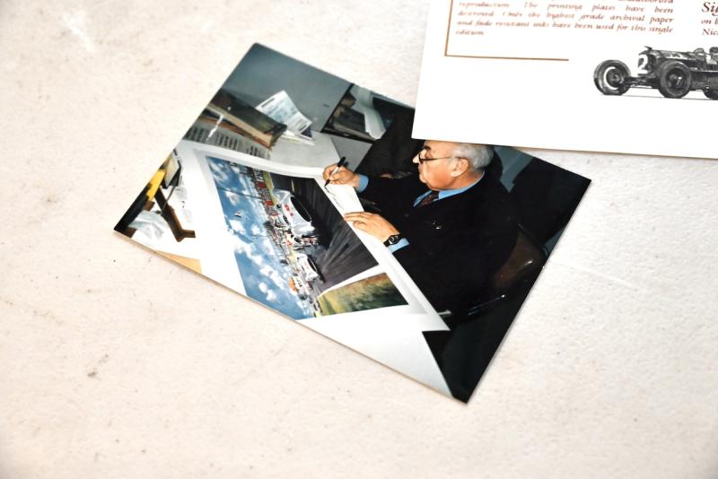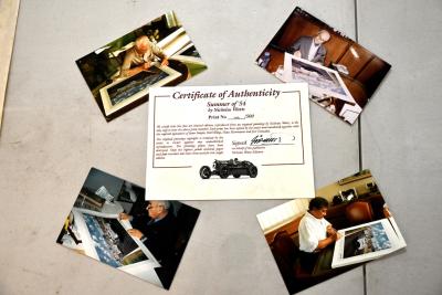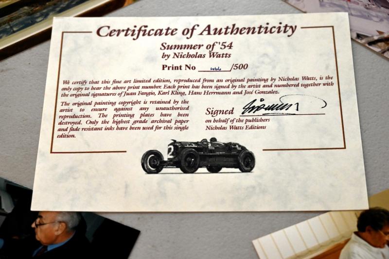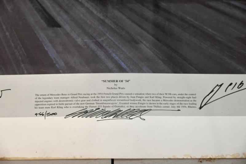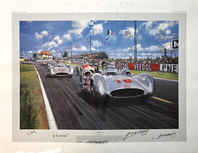 Lot 8 of 525: NICHOLAS WATTS: A limited edition (466/500) unframed print titled ‘Summer of ’54’ by Nicholas Watts depicting the Mercedes-Benz W196 Streamliner at the 1954 French Grand Prix, signed by Juan Manuel Fangio and other drivers, with a Certificate of Authenticity, 82cm x 63cm [Location: Sydney]