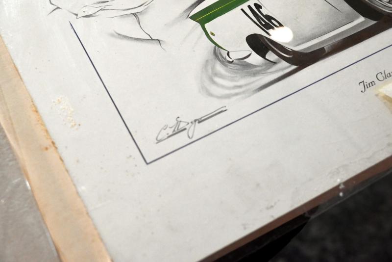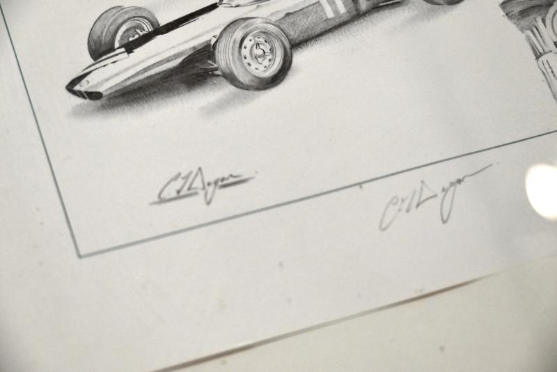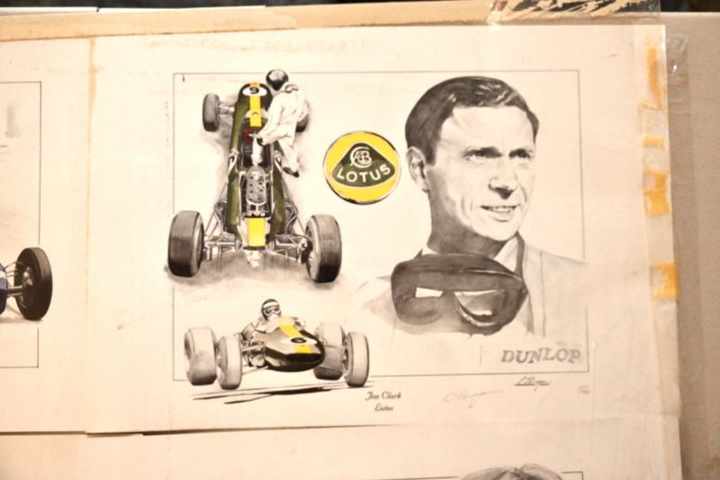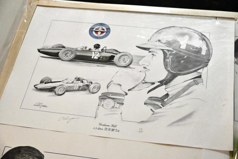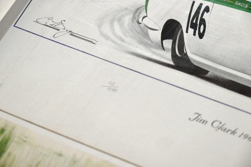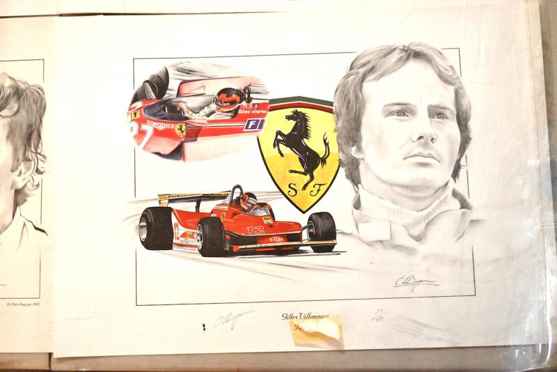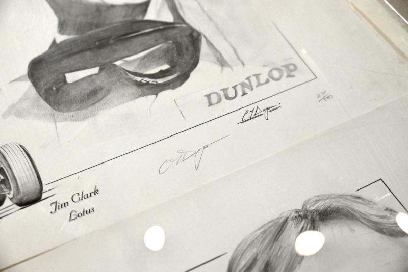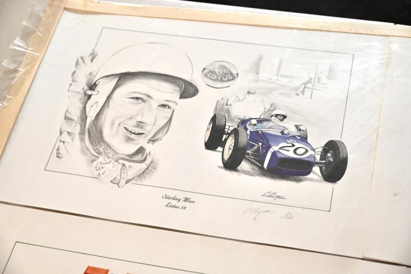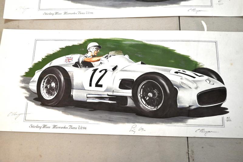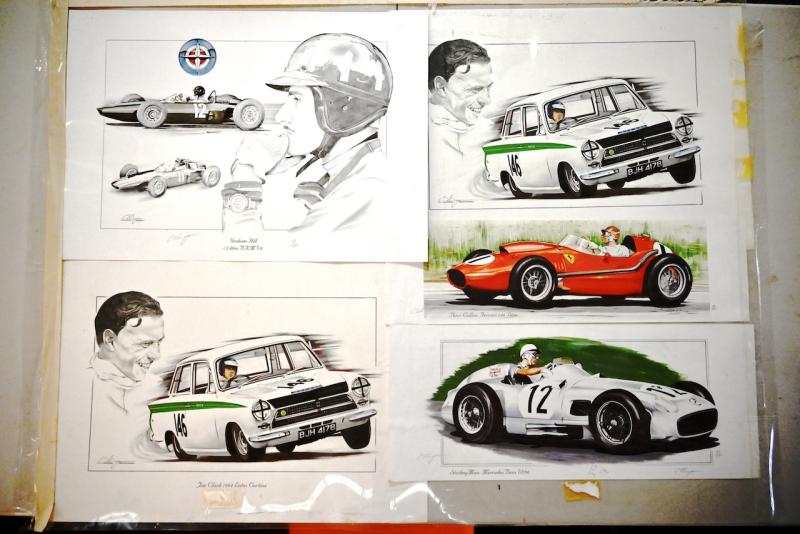 Lot 13 of 525: CHRIS DUGGAN: Ten unframed prints by Chris Duggan depicting Grand Prix drivers Peter Collins, Graham Hill, Jim Clark, Stirling Moss, Jochen Rindt and Gilles Villeneuve, each numbered and signed by the artist, one piece signed by Stirling Moss, various sizes [Location: Sydney]