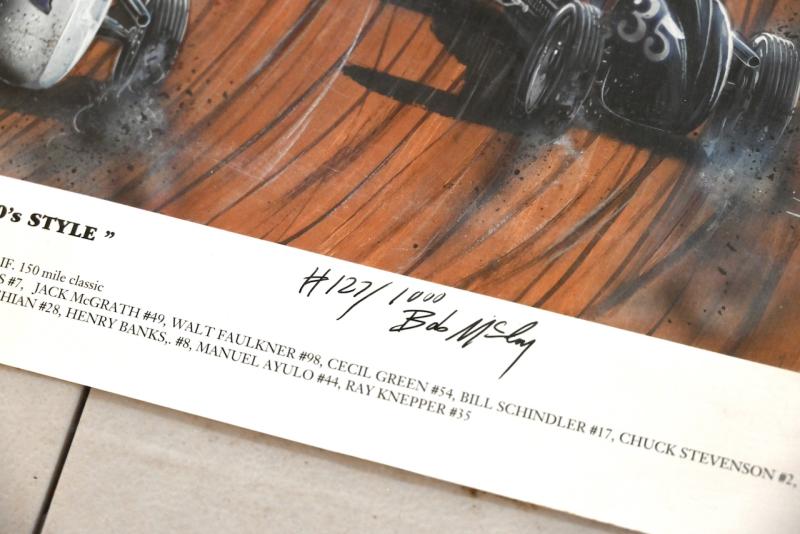 Lot 20 of 525: SPEEDWAY: “DIRT TRACKING 50’s STYLE” unframed print by Bob McCoy, a Limited Edition (127/1000) print depicting the 1950 Bay Meadows 150 miles classic, signed by the artist, 57cm x 49cm [Location: Sydney]