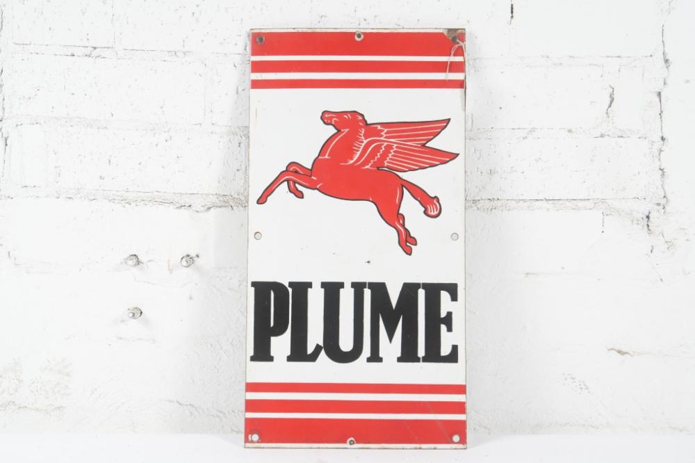 Lot 12 of 175: PLUME: An original Plume enamel sign featuring the Flying Pegasus, sign as used on pumps of the period, 50cm high, 26cm wide