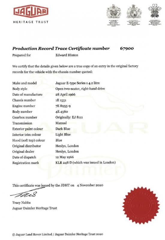 Lot 35 of 528: 1966 JAGUAR E TYPE SERIES 1 4.2 ROADSTER (single family ownership for over 47 years)