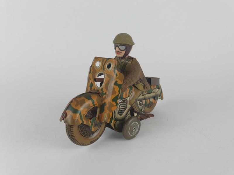 Lot 26 of 528: MILITARY: Military Motorcycle by Mettoy UK with flint gun, camouflaged, 19 cms, c1940s with later replacement head