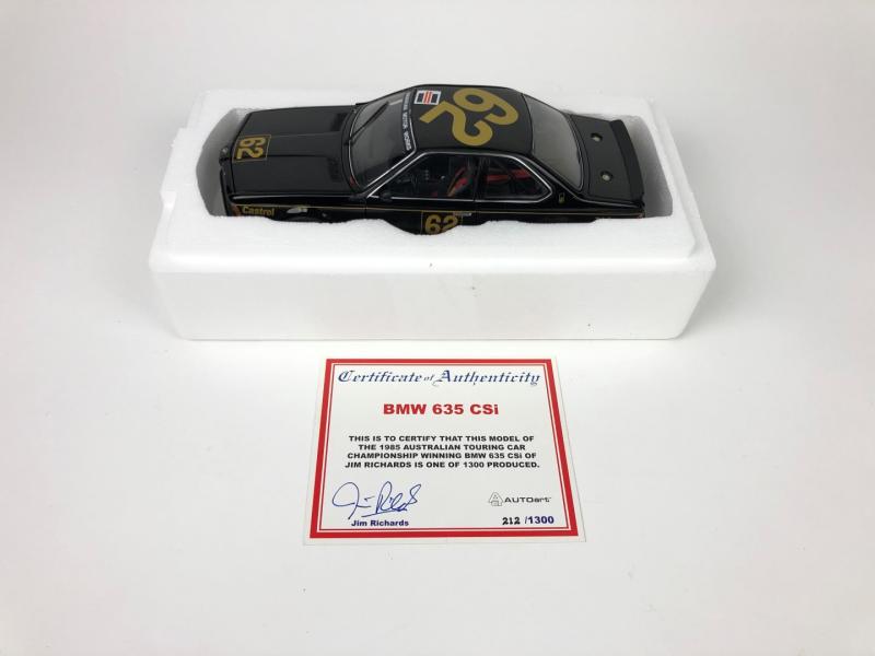 Catalogue Auction info A Lifetime Passion- Models from the Collection of Bill Ahearn(#114) 10/07/2020 10:00 AM AEST - 19/07/2020 4:13 PM AEST CLOSEDFirst Lot Begins Closing 19/07/2020 4:13 PM AEST Lot 41 of 168: BMW 635 CSi: An Autoart BMW 635 CSi as raced by Jim Richards in 1985 ATCC. Jim Richards signature CLICK IMAGE TO ENLARGE PreviousNextSimilar Items Lot closed - Winning bid:$835 A Lifetime Passion- Models from the Collection of Bill Ahearn(#114) 10/07/2020 10:00 AM AEST - 19/07/2020 4:13 PM AEST CLOSED First Lot Begins Closing 19/07/2020 4:13 PM AEST Description VIN: Engine No: Registration: Description: BMW 635 Csi: A 1:18 scale Autoart BMW 635 CSi as raced by Jim Richards to Championship victory for the 1985 Australian Touring Car Championship, limited edition, numbered 212/1300, CoA signed by Jim Richards; boxed with inner packaging and narrative leaflet. Categories: Model Shipping info
