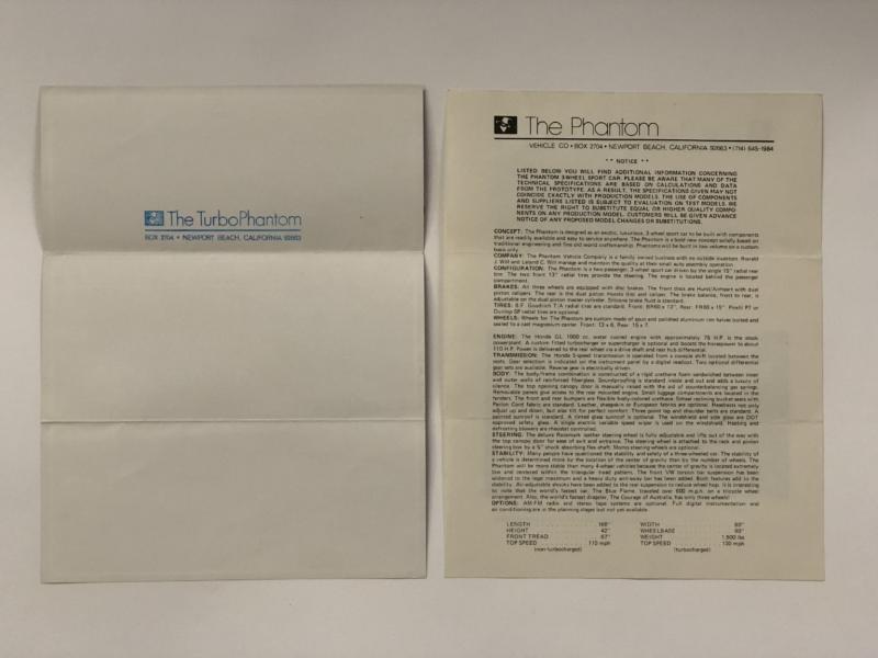 Lot 56 of 384: CONCEPT/KIT CARS: Three sales brochures pertaining to concept/kit cars. TurboPhantom sales brochure