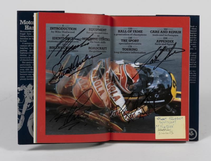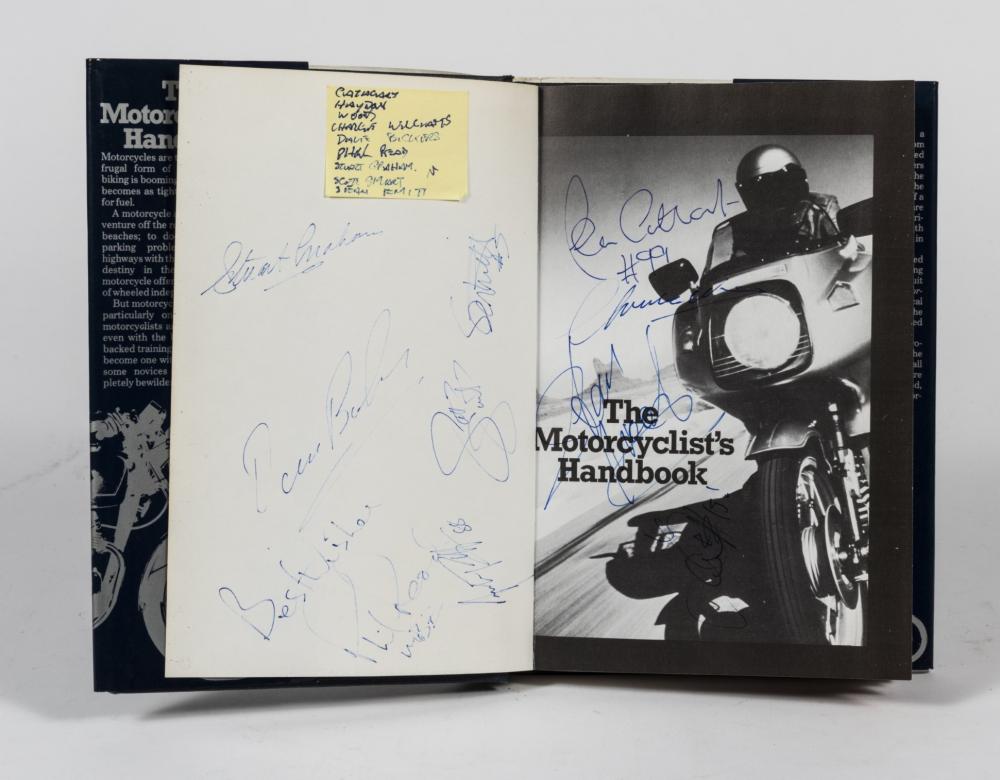 Lot 59 of 431: MOTORCYCLES: A 1981 edition of 'The Motorcyclist's Handbook' hardcover book by David Minton. (Numerous Motorcycling signatures. Agostini, Surtees, Read signatures)
