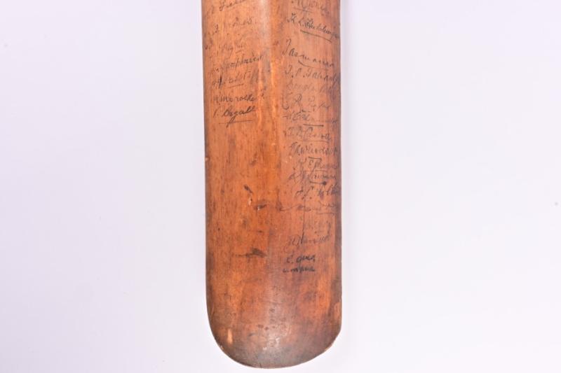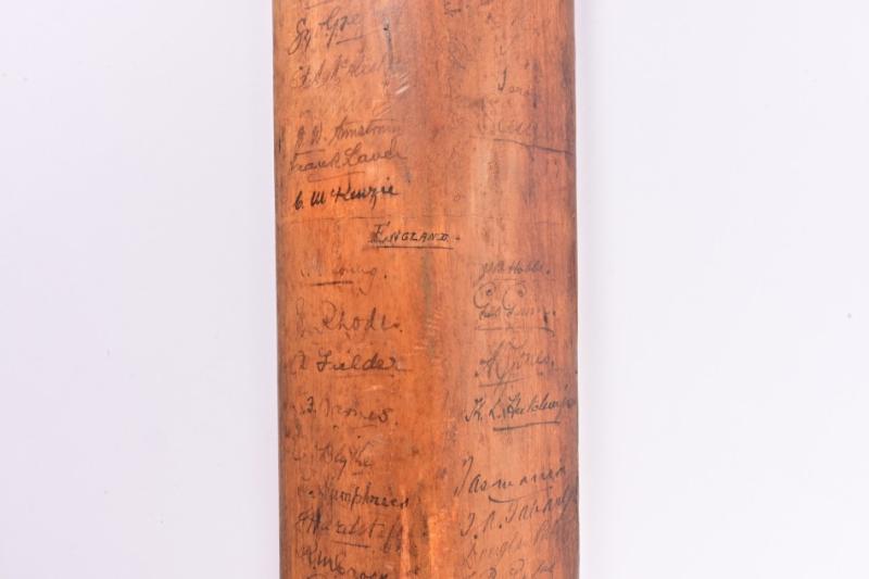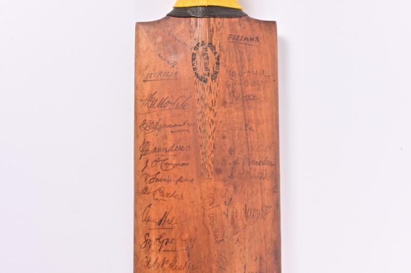 Lot 38 of 286: 1907/8 CRICKET BAT: A rare and interesting cricket bat signed by the England, Australian, touring Fijian (Mbau Island) and Tasmanian cricket teams during the 1907-1908 Ashes series, including the signature of Victor Trumper. Further identifiable signatures are listed below.
