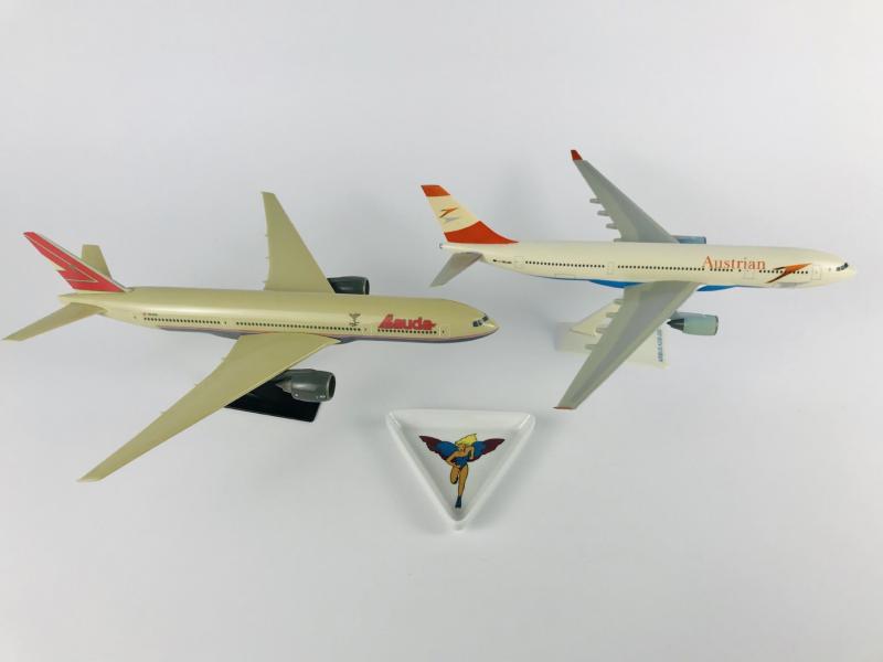 Lot 73 of 190: AUSTRIAN AND LAUDA AIR: 3 items: A 1:100 scale (32cm long) Austrian Airlines Airbus A330-220 plastic model, registration 'OE-LAN', A 1:100 scale Lauda Boeing 777-300 plastic model, registration 'OE-LPA' and one Lauda Air triangular serving plate.