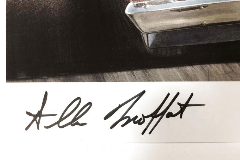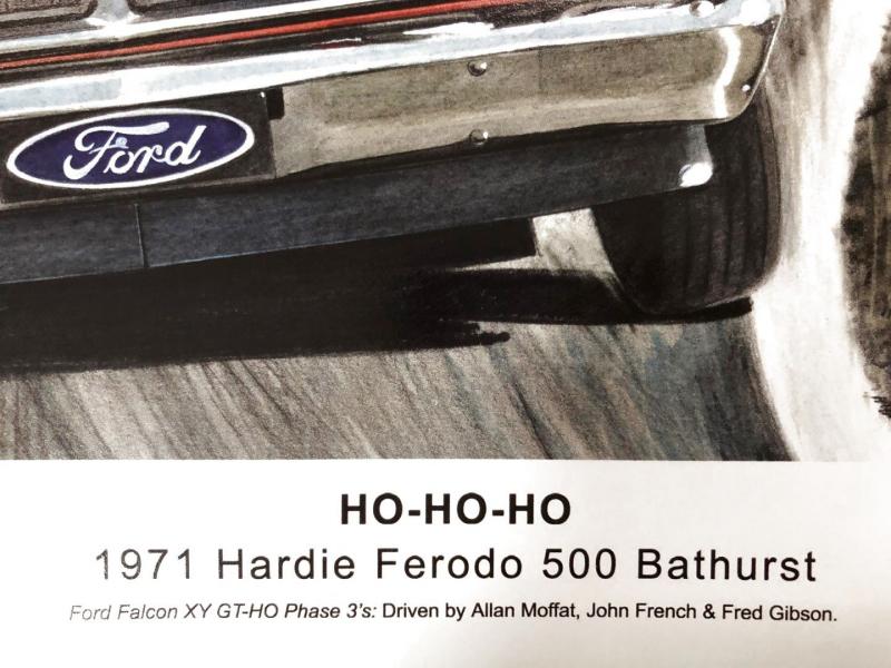 Lot 245 of 407: Moffat: Print "Ho-Ho-Ho" depicting a 1971 Hardie Ferodo 500 Bathurst racing, signed by Allan Moffat. 42 cm wide, 30 cm high.