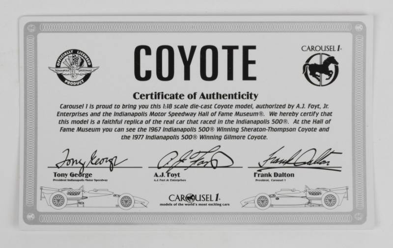 Lot 34 of 563: COYOTE: A limited edition 1:18 sale Carousel 1 Coyote - 1967 Indianapolis 500 Winner #14 A.J Foyt with CoA