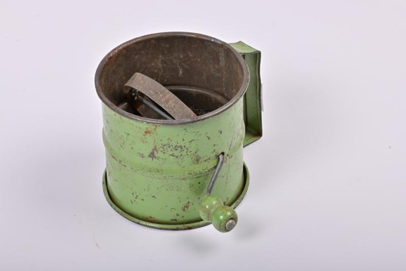 Lot 74 of 539: KITCHENALIA: A metal water carafe, a small flour sieve and a small oil lamp, the carafe 20cm high