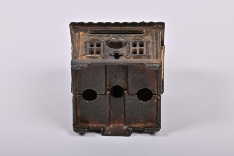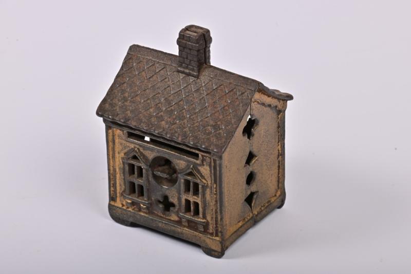 Lot 146 of 539: MONEY BOX: An American gilt painted cast iron Quatrefoil House money box made by Stevens/Wing/Arcade between 1902-1926, 10cm high