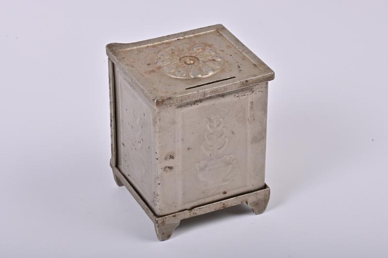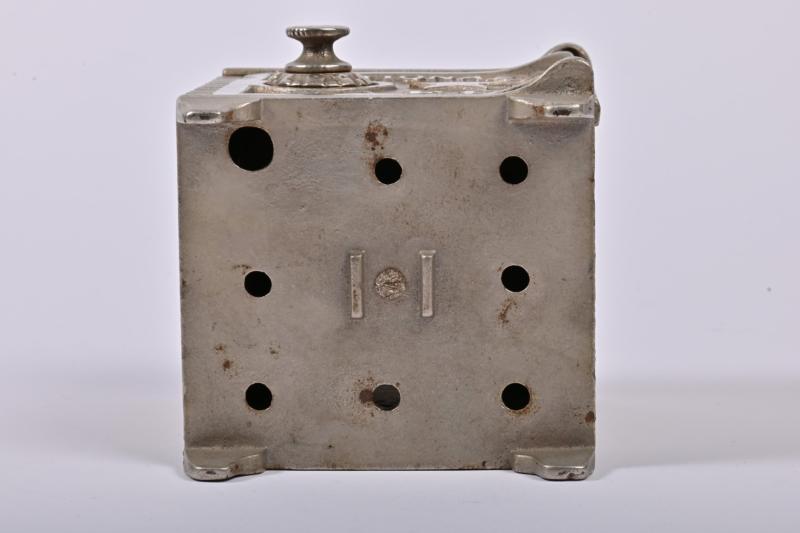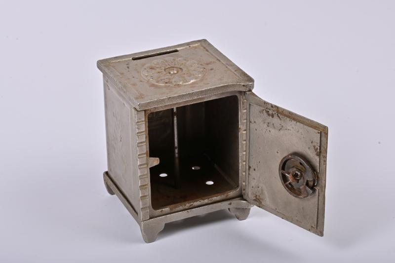Lot 150 of 539: MONEY BOX: A 1920s American nickel plated cast iron and steel National Safe, 12cm high