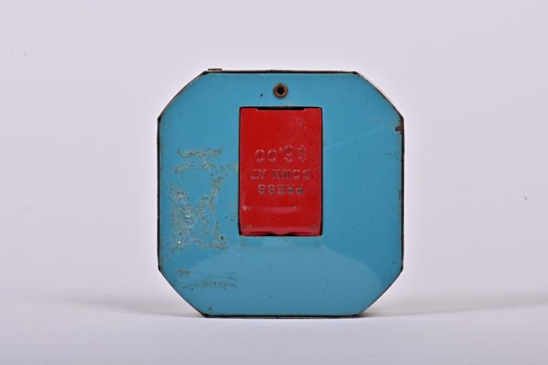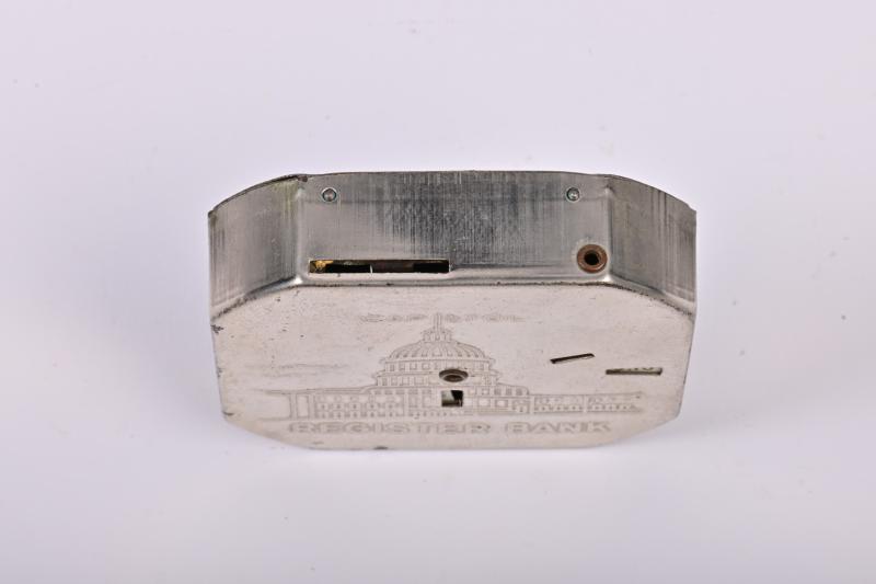 Lot 195 of 539: MONEY BOX: A 1930s American nickel plated tin Capitol dime registering money box, 6.5cm high