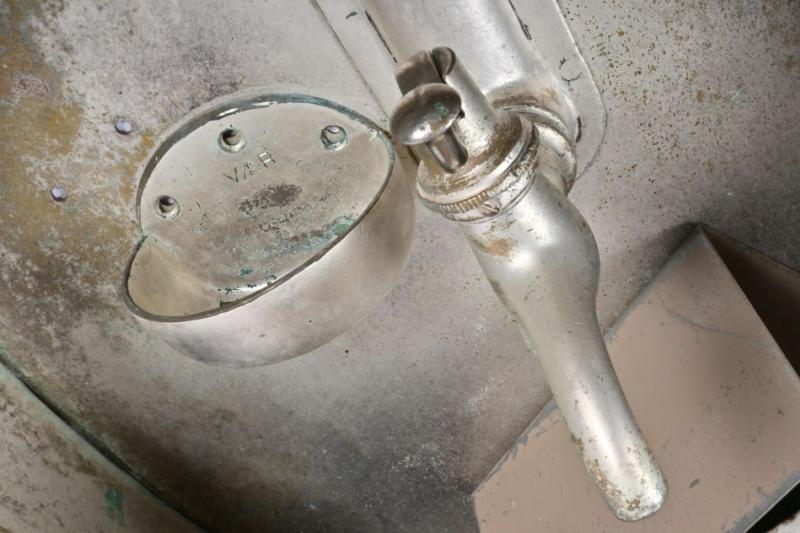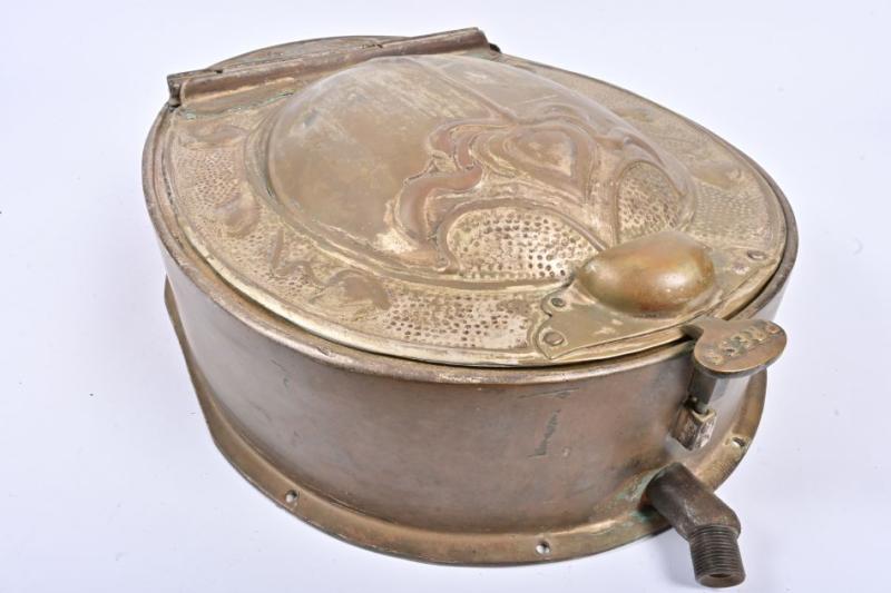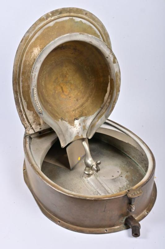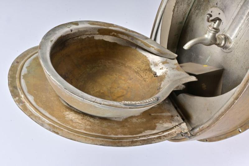 Lot 16 of 568: VICTORIAN RAILWAYS: An Art Nouveau brass pull down hand basin from wooden bodied carriage, circa 1920, 75cm high, 46cm wide, 18cm deep