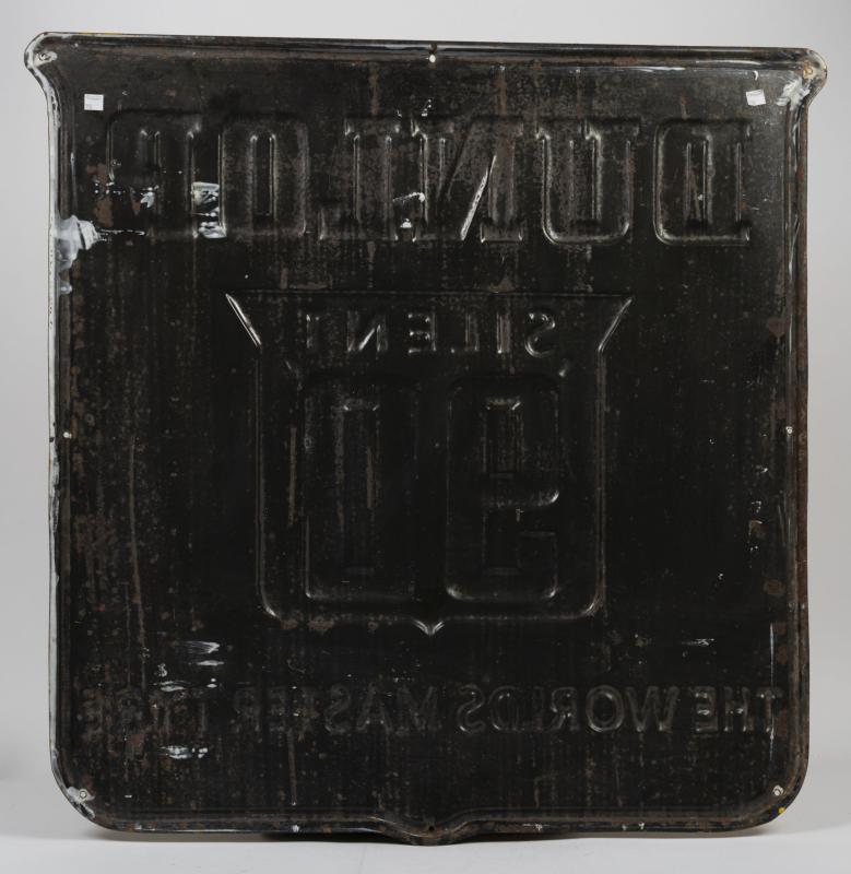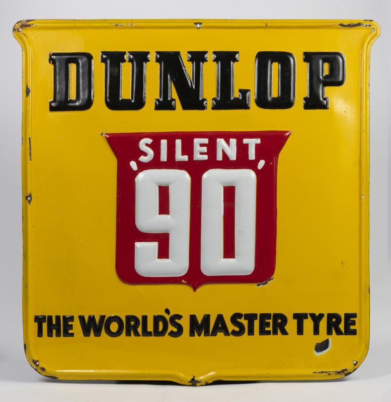 Lot 190 of 558: DUNLOP: A circa 1935 original Dunlop embossed shield form enamel sign, 88.5cm high x 88.5cm wide