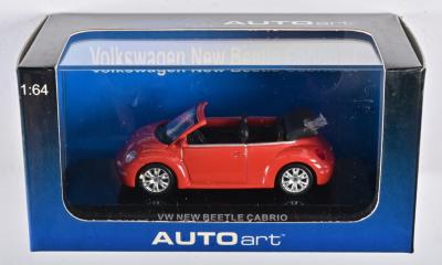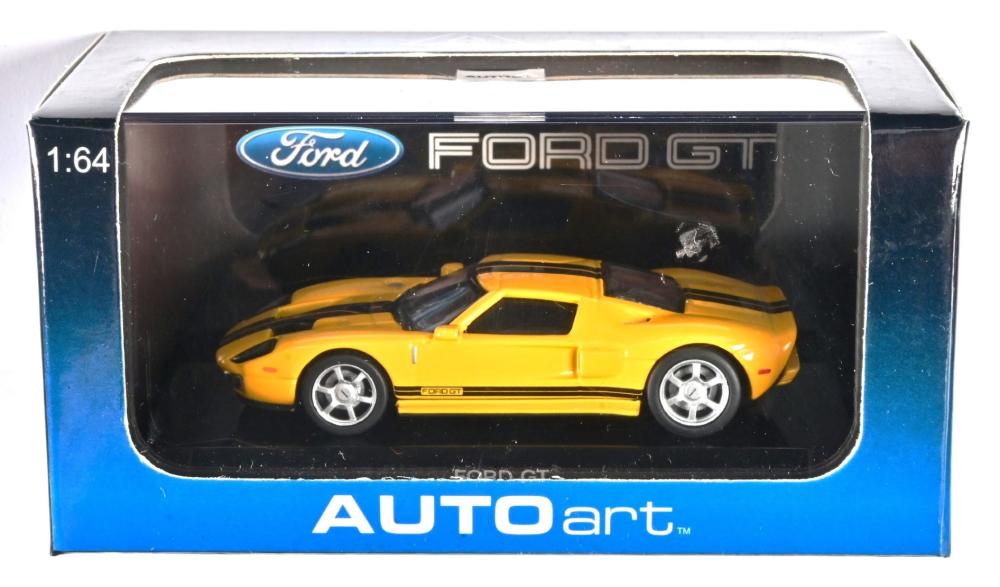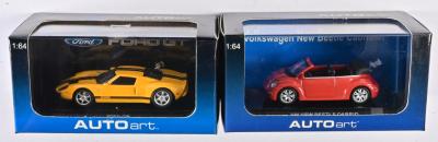 Lot 136 of 524: FORD: A 1:64 scale NOS Autoart Ford including 2 models Ford GT 2004 yellow with black stripes and VW New Beetle Cabrio 2002 sundown orange die-cast model