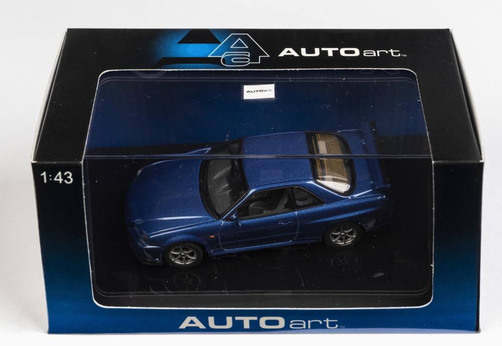 Lot 221 of 524: NISSAN: A 1:43 scale NOS Autoart Nissan Skyline R34 GTR 1999 blue die-cast model