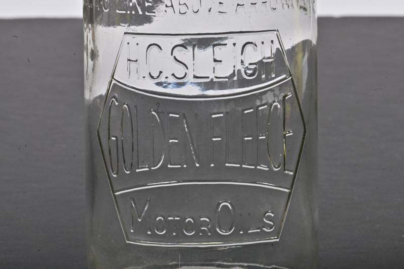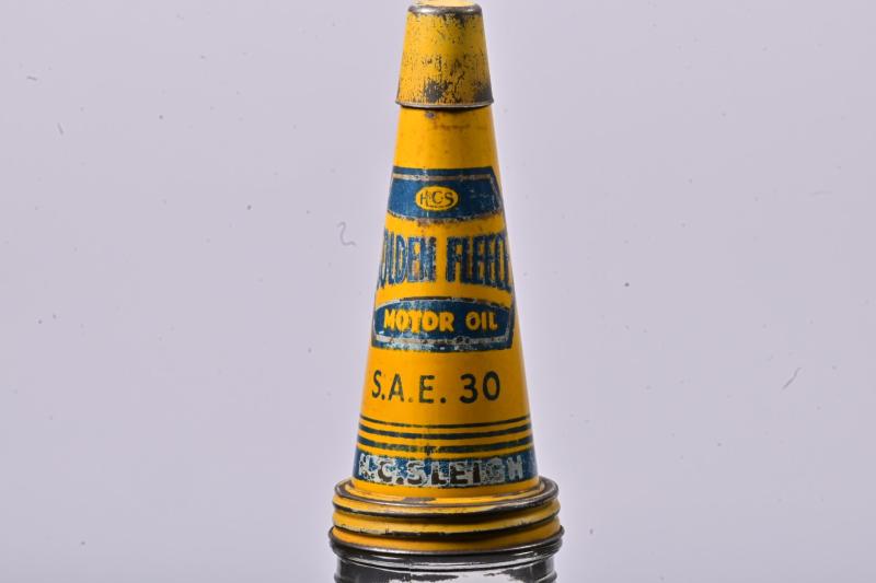 Lot 13 of 643: GOLDEN FLEECE: An early 1940s one imperial quart embossed HC Sleigh, Golden Fleece glass oil bottle with SAE 30 tin oil pourer and dust cap