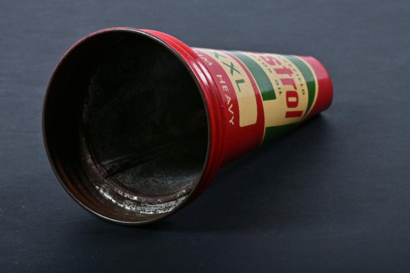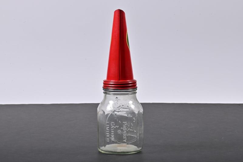 Lot 75 of 643: CASTROL WAKEFIELD: An embossed one pint Castrol Wakefield glass oil bottle with a rare NOS XXL Castrol Wakefield motor oil tin pourer with the sought after "Wakefield" inclusion in the "flash" logo