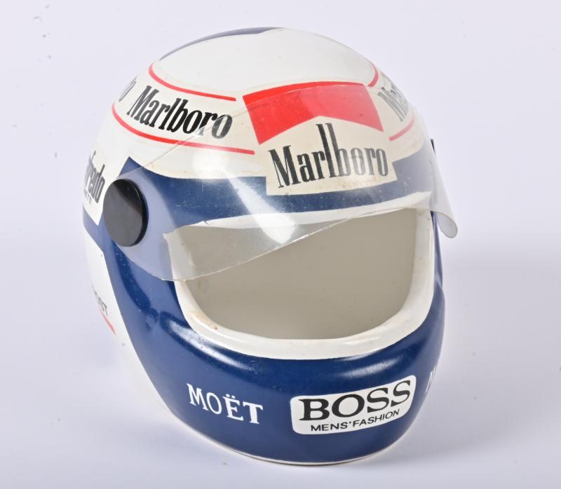Lot 323 of 643: ALAIN PROST: A small ceramic model of Alain Prost's helmet, 11cm high