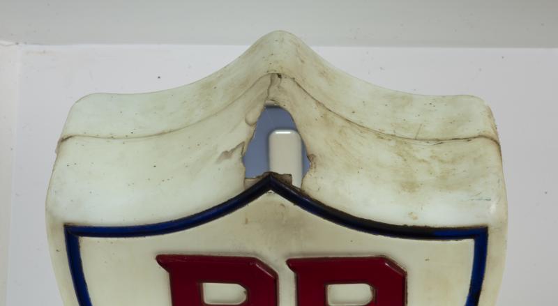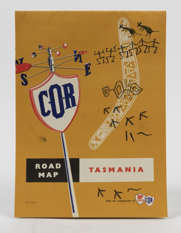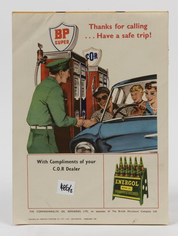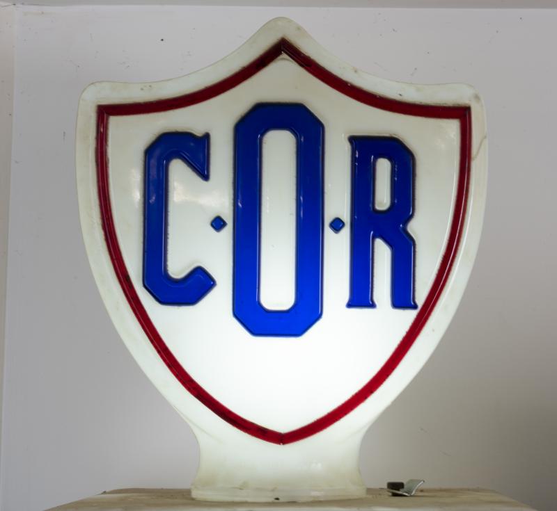 Lot 485 of 643: BP/COR: A rare double sided petrol bowser pump globe from a double pump displaying BP Super on One side and COR on the other, the double branded signs where only used between 1957-59, with a COR road map of Tasmania with advert showing the double pumps, 32cm high, some damage to the BP side, 32cm high