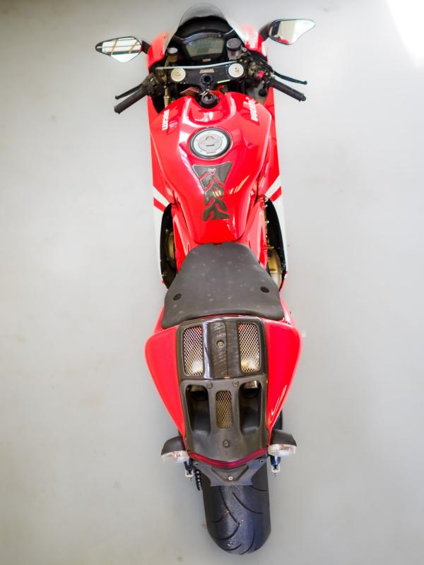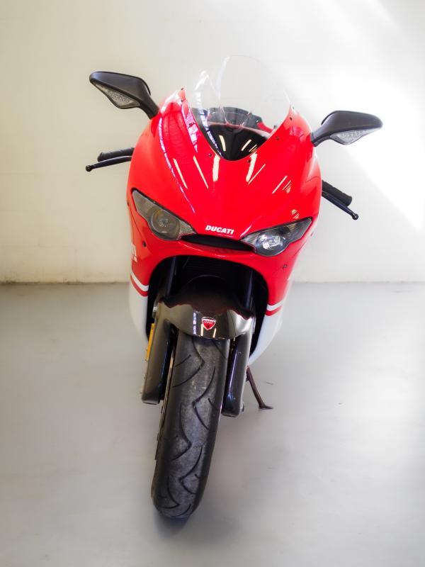 Further racing influences included a pair of Brembo radial ‘monobloc’ front brake calipers with four 34 mm pistons and 330mm discs. Alan Jenkins was responsible for the style of the carbon-fibre bodywork, aluminium tank, and colour scheme, with two versions available. These were the Rosso GP with a white number plate on the tail section and a white Ducati logo on the fairing, and the Team Version painted like factory Corse bikes, with a white stripe on the fairing. A team sponsor decal kit was provided with each bike and is included in the lot. They also came with a new lightweight multifunction dashboard, as fitted to the 2007 Desmosedici GP7. Production commenced in October 2007, with final delivery of the 1500 examples completed by the end of 2008.