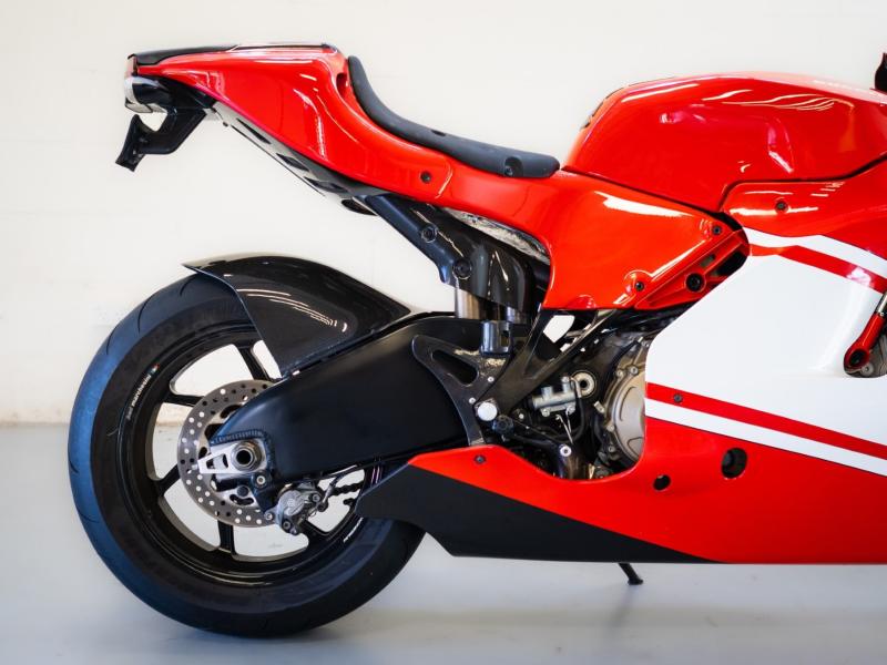 The demise of the 990 provided Ducati an opportunity to repeat the success they had earlier achieved with the round-case “Green Frame” 750 Super Sport in 1974 after their spectacular 1972 Imola 200 victory. The D16RR, the first and only road-going MotoGP replica, was derived from the Desmosedici GP6, the body design and the aerodynamics following the same form. As on the GP6, the engine on the RR was a 16-valve desmodromic 989 cc Vee-four, with an 86mm bore and 42.56mm stroke and an asymmetrical Twin Pulse firing configuration. The double overhead camshafts were gear driven, and the six-speed gearbox a cassette type. The clutch was a hydraulically actuated dry multi-plate slipper type. Due its limited production the aluminium engine crankcases and cylinder heads were sand-cast, connecting rods and valves titanium, and the engine covers sand-cast magnesium. Four 50mm Magneti Marelli throttle bodies, with 12-hole ‘microjet’ injectors fed the cylinders, and were controlled by a Magneti Marelli 5SM ECU. A 4 into 2 into 1 exhaust, with vertical exit muffler in the tail contributed to a claimed 200 horsepower at 13,800 rpm (with the 102 dB racing silencer and dedicated CPU). Despite this extrememly high power output the Desmosedici RR was homologated for road use, with an exhaust catalytic oxygen sensor to comply with Euro3 emissions.