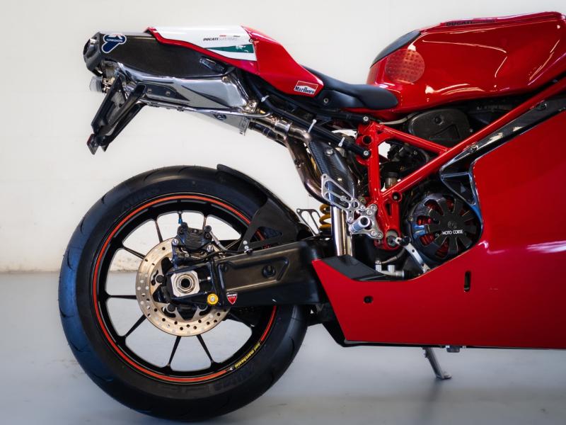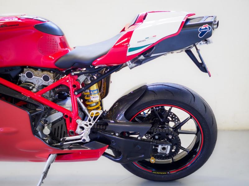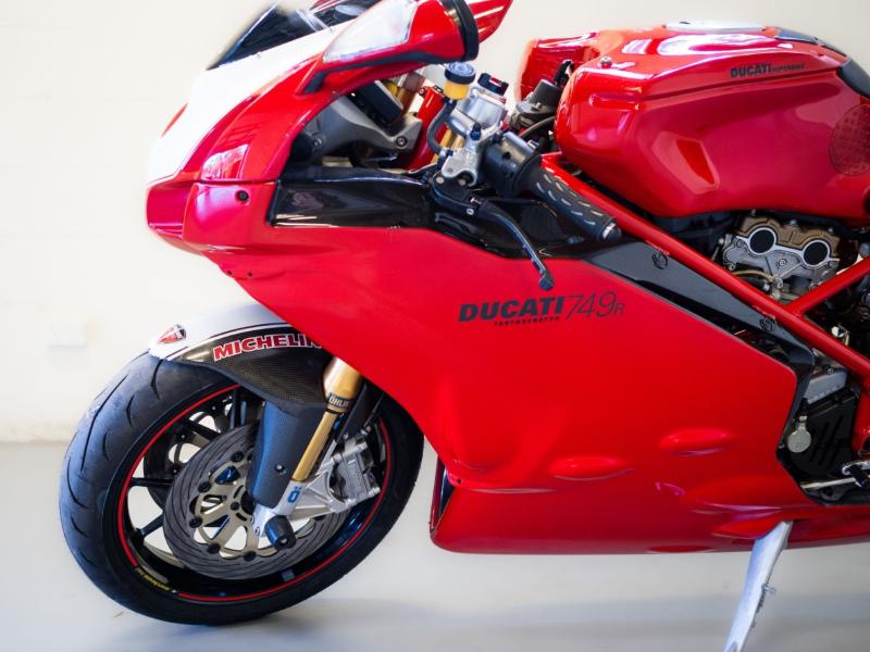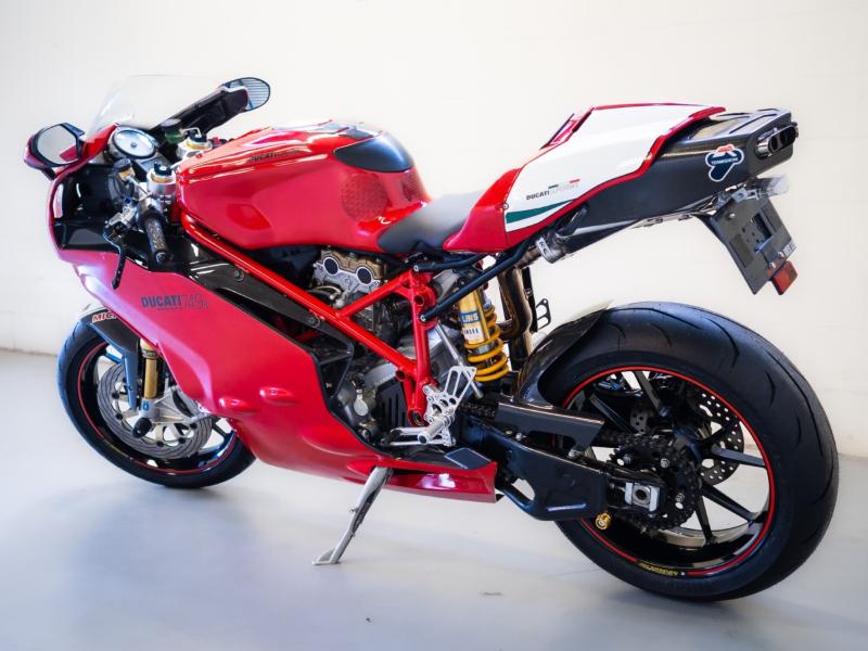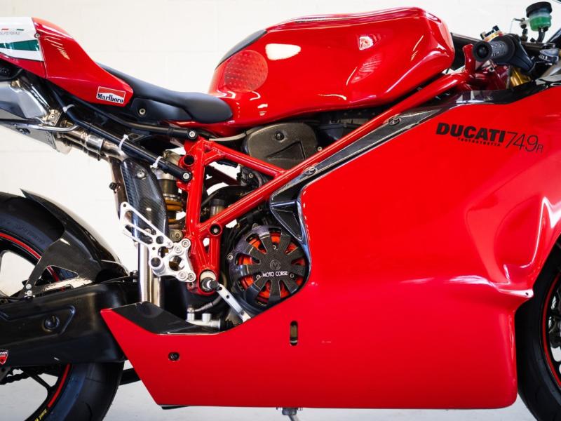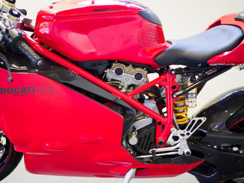 The chassis included a new aluminium swingarm, similar to the 999 F03 World Superbike racer. The pivot area was cast aluminium, while the arms were box sectioned, the left side featuring lower reinforcement. It also incorporated Superbike type chain adjustment sliders instead of a conventional cam mechanism. Also new was the rear suspension linkage, with FLAT progression, including a different spring and shorter stroke (from 71 to 56mm) for the Öhlins shock absorber. The rocker arm was positioned above the shock absorber with a revised push-rod mount. As on the 999R, the 43mm Öhlins front fork allowed for radial Brembo brake calipers, and the forged aluminium wheels featured five “Y” spokes with 10 anchor points on the inside of the rim. For racing, the fork offset could also be altered via a pin. There were two settings, 30 and 36mm, but this feature was disabled for street use. As it was such a high specification model Ducati only produced around 1000 749Rs, as required for FIM homologation for 2004 and 2005.