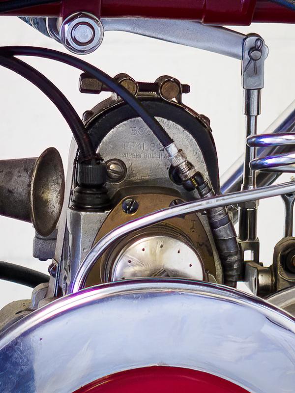 By 1926 the success of Moto Guzzi’s racing program was beginning to pay dividends and Guzzi introduced a 250 alongside the 500 C4V. With the classic Guzzi layout of a horizontal engine, tubular double-cradle frame and three-speed unit gearbox now well established, the 250 also followed this pattern. Unlike the 500, the 250 engine had square dimensions, with a 68x68mm bore and stroke, and a bevel-gear driven single overhead camshaft operating two valves. These had an included angle of 58 degrees, a very narrow angle for that time, and this undoubtedly contributed to be very high specific power output. In 1926 this was an extraordinary figure for normally aspirated engines, and only matched by the Delage and Bugatti Grand Prix cars. With an 8:1 compression ratio, the 15 horsepower was produced at 6,000rpm. Lubrication was dry sump and the oil reservoir was situated on top of the petrol tank.