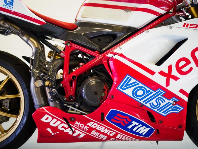 This 2010 Ducati 1198 S is presented in colours replicating the factory World Superbike racers not the red, whiter and black 1198 S Corse colours. It is offered in excellent running condition but there is evidence of minor body damage and previous crankcase repair. Bike would ben from mechanical attention for rear cylinder oil leak. Accompanying the sale is one key and no books.