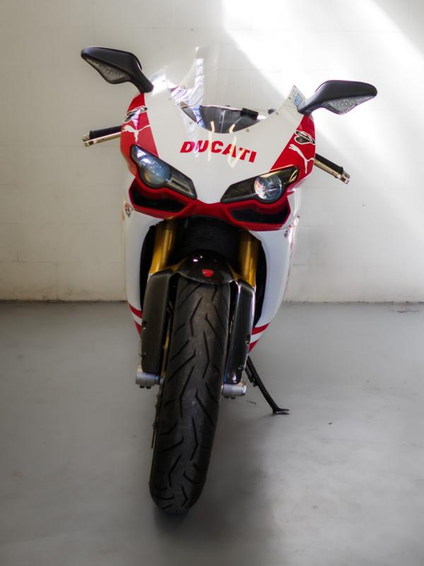 The trellis steel frame was unchanged; with 34mm main section tubes 1.5mm thick, while the 1198 was offered as a Biposto the 1198 S was Monoposto only. The 1198 included Showa suspension while the 1198 S featured a higher specification 43mm Öhlins fork with titanium nitride-treated sliders, with Brembo radial brake caliper mountings and an Öhlins rear shock absorber. The single-sided aluminium swingarm was unchanged from the 1098 as were the 330mm front Brembo Monobloc brake calipers with 34mm pistons. New for the 1198 S were seven-spoke forged and machined Marchesini wheels. Further weight saving extended to a cast-magnesium front headlamp mount and the 1198’s two polyellipsoidal headlights saved 0.4kg over the 1098. The taillight and indicators used LEDs and the 1198 S included an Öhlins steering damper. Along with the increase in power the most significant update on the 1198 S was the inclusion of electronic traction control. Accessible from the left-hand switchgear and displayed on the digital instrumentation, this offered a choice of eight profiles each programmed with a wheel-spin tolerance matched to a progressive riding skill. With a dry weight of only 169kg the 1198S offered class-leading performance. To celebrate winning the 2009 World Superbike and Superstock Manufacturers’ titles Ducati presented two Corse special editions, both also marking the introduction of a new Ducati Corse logo. The 1198 S Corse Special Edition featured a larger capacity factory team-style aluminium fuel tanks, and a matching natural aluminium swingarm