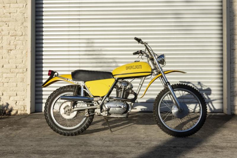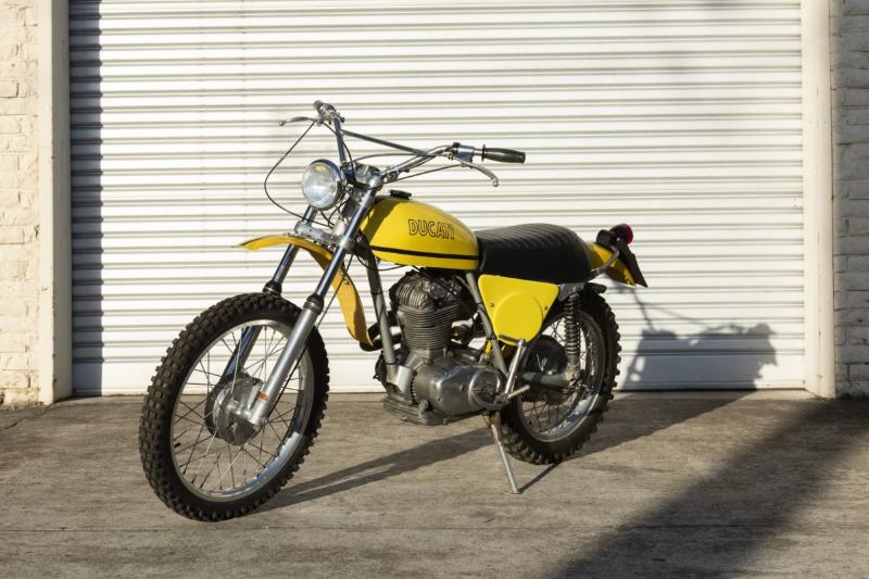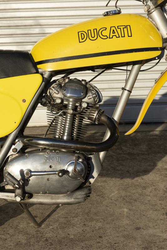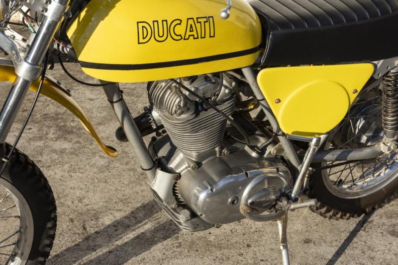 As delivered from the factory in 1971 the 450 R/T was rather idiosyncratic. The delineation between racing and leisure use was blurred and even when fitted with street equipment the rudimentary electrical system didn’t include an engine stop or ignition switch. The method recommended in the owners’ manual was suitably vague, stating, “To stop the engine, incline the motorcycle.” But the new frame and improved suspension allowed the 450 R/T to be the best handling off-road Ducati yet, and a genuine alternative to the BSA 441 Victor. The R/T was elegant and impressively styled, but was primarily only available in 1971 and 1972. With only 422 manufactured, most of these sold in the US, it is a very rare model.