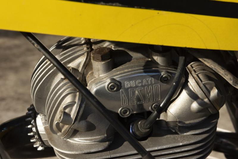 This 1971 Ducati 450 R/T is a US import and is presented in very original condition. In the interest of safety an engine kill switch has been fitted, while street equipment includes a headlight and taillight. The exhaust has been wrapped to prevent leg burns, the decompressor works, the carburettor includes the correct jets and the engine has been checked for spark and compression. It was running before storage a few t=years ago. The fin on the bottom left of the sump is chipped. We are informed by the vendor the bike is in good running order.