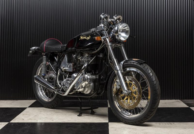 This matching number 1966 Norton Atlas has benefitted from a full café racer modification It includes a belt primary drive, aluminium Akront wheels, single Brembo four-piston front brake with a floating disc, Hagon shocks, custom fuel tank, custom dash, and Honda switches. It was imported into Australia from the United States several years ago and received a replacement swept back chrome exhaust system. The Smiths speedometer reads only 260 miles.