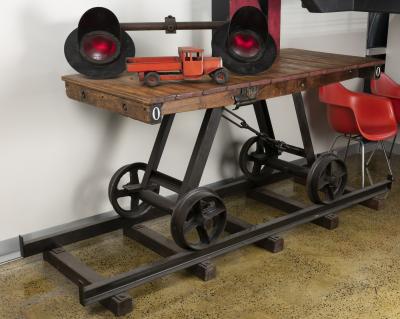 HALL TABLE: A decorative railway platform trolley adapted to table on track base, with 'MB' cast metal logo to the support rail, 102cm high, 242cm wide, 81cm deep