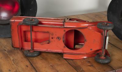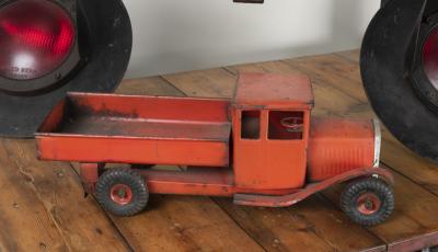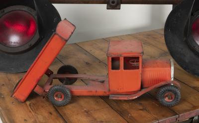 TRIANG: A circa 1940s/1950s pressed metal Triang Toys tipper truck, 17cm high, 49cm wide
