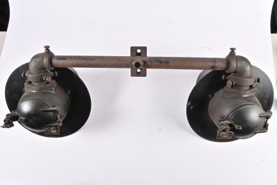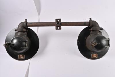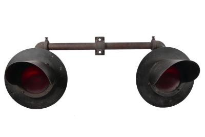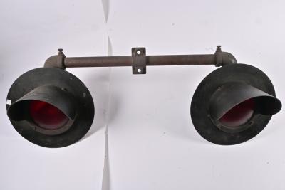 RAILWAY: A pair of red sealed beam railway crossing lamps with mounting bracket, overall 43cm high, 108cm wide